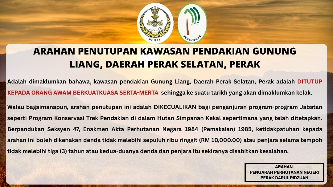ARAHAN PENUTUPAN KAWASAN PENDAKIAN GUNUNG LIANG, DAERAH PERAK SELATAN, PERAK